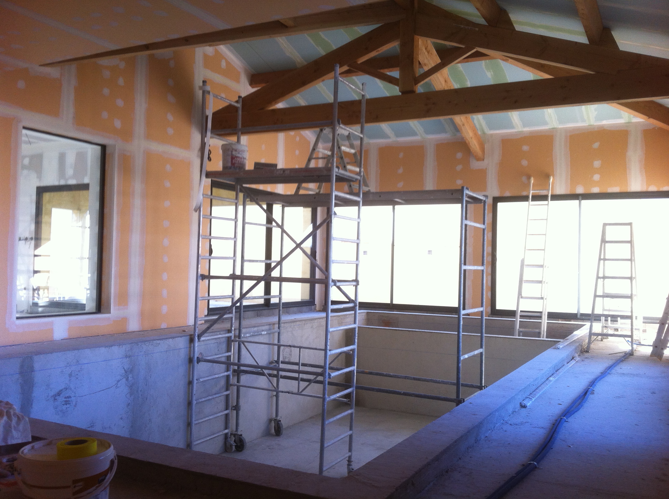 Enduit + peinture d’une piscine intérieur & son plafond avec poutres apparentes